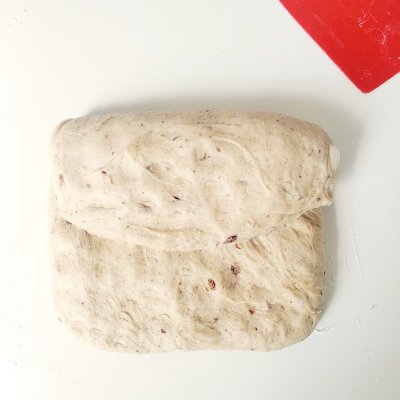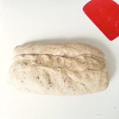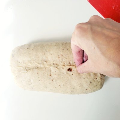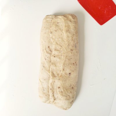 - Bring the dough onto your workspace with the nice side facing down. Tapping it gently into a rectangle, the short side a bit bigger the size of the loaf pan.[Optional: When you want to trime the size, now it's the time. Check the 'TiP' in the recipe notes at the bottom!]