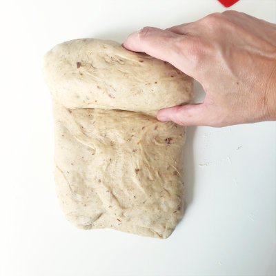 - Fold the short side to the middle, followed by the other, overlapping each other lightly. Turn the dough 90°, gently tapping again. (pics 1-3)Now roll up from the short side, pinch the seam together and roll the whole log a bit wider, to the size of the pan. (pic 4+5)