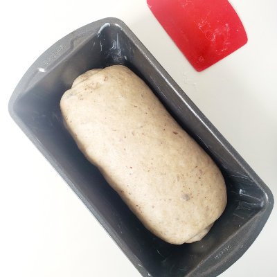- Grease or line the loaf pan with parchment paper. Place the dough into the pan, cover losley with cling foil. Let rise for ~45 min until 1/2 inch above the rim.