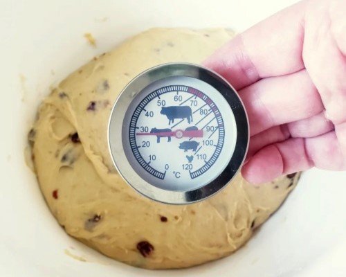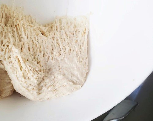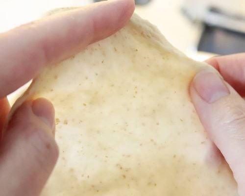 - Stop the machine and make a windowpane test. -> With floured fingers pull away a golf ball sized dough piece. Gently stretch out a piece of dough until it gets a very thin translucent layer without tearing. It tears too early? Knead the dough 3 more minutes and test it again. The dough will now have a temperature of ~24-26°C / 75-78°F. TiP: When it gets way warmer (>27°C / 80°F) too early in the process, stop the machine for ~10 min and go ahead.
