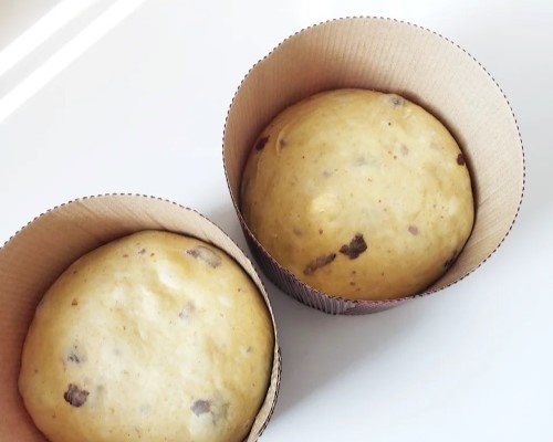 - Place the baking molds on a half size baking sheet each.Lightly flour the workspace, add the dough, divide in two equal pieces. Shape each piece into a ball. -> first stretch the edges into the middle from 3-4 sides to give the dough more stability. Then turn it upside down and shape it with your inner edges of the palms into rounds. Lay the dough pieces gently into the molds, seam facing down. Cover with cling foil, let rise at room temperature until it's just under the edge (~1 hour).